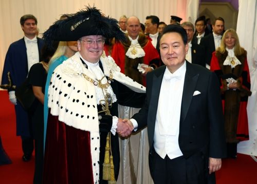 영국을 국빈 방문한 윤석열 대통령이 22일(현지시간) 런던 금융특구 길드홀에서 열린 런던금융특구 시장 주최 만찬에 도착해 마이클 마이넬리 런던 금융특구 시장의 영접을 받고 있다. 연합뉴스 |