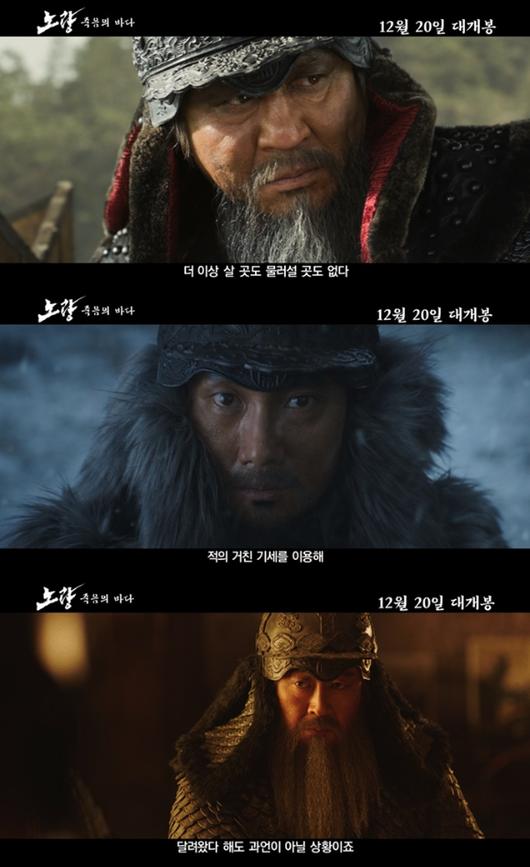 그 중에서도 최후의 전투를 알리는 '노량: 죽음의 바다'는 살아서 돌아가려는 왜와 전쟁을 완전히 끝내려는 조선의 난전과 이순신의 마지막 전투를 압도적 스케일로 펼칠 것을 예고한다. 여기에 명나라까지 합류해 총 약 1,000여 척이 싸운 역사적 해전을 바탕으로 영화적 상상력과 전쟁의 스펙터클한 볼거리를 더해 압도적 스케일로 이순신 3부작의 마지막 전투를 더욱 성대하게 채울 것으로 기대된다.