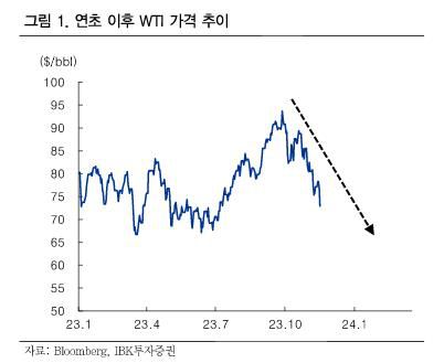 변준호 IBK투자증권 연구원은 이날 보고서에서 "유가가 단기 급락한 영향으로 반등 가능성도 열려 있으나, 미국 경기 둔화 양상과 북반구 겨울철 진입에 따라 WTI(서부텍사스산원유) 기준 70달러대에서 하향 안정화가 지속될 것으로 예상된다"며 "유가 하락 수혜주를 주목할 필요가 있다"고 밝혔다.