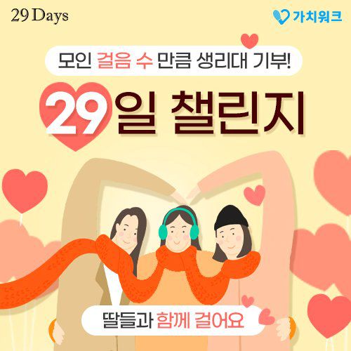 2018년부터 국내 약 15개 대학교 캠퍼스 내에서 ‘무상 생리대 비치사업’을 진행해온 29Days와 ‘사랑의 연탄 챌린지’를 성황리에 진행하여 연탄 1만장 이상 기부 적립된 가치워크의 ‘딸들과 함께 걸어요, 29일 챌린지’는 가치워크 앱을 통하여 누구나 참여할 수 있다. 걸음으로 기부를 실천하며 쌓인 포인트는 저렴한 가격에 필요한 물품을 구매할 수 있는 가치몰, 건강검진 데이터를 이용한 AI건강리포트, 영양제 구독 등에 사용할 수 있다.