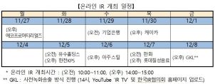 이번 제3차 온라인 IR은 오는 27일 에코프로머티리얼즈를 시작으로 온라인 화상회의(8사) 및 사전녹화송출(1사) 방식으로 다음 달 8일까지 진행된다.