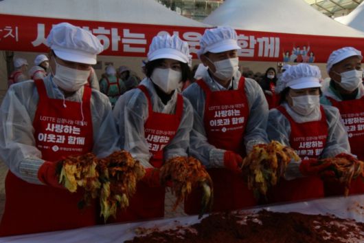 롯데삼동복지재단이 24일 금요일 롯데백화점 울산점 광장에서 'LOTTE 김장나눔 대잔치 사랑하는 이웃과 함께' 행사를 열었다. 행사에는 자원봉사자 50명과 울산 중구청 관계자, 롯데 계열사 임직원 100여명이 참여했다.