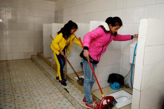 아이들이 중국 구식 화장실을 청소하는 모습. 사진 유니세프 |