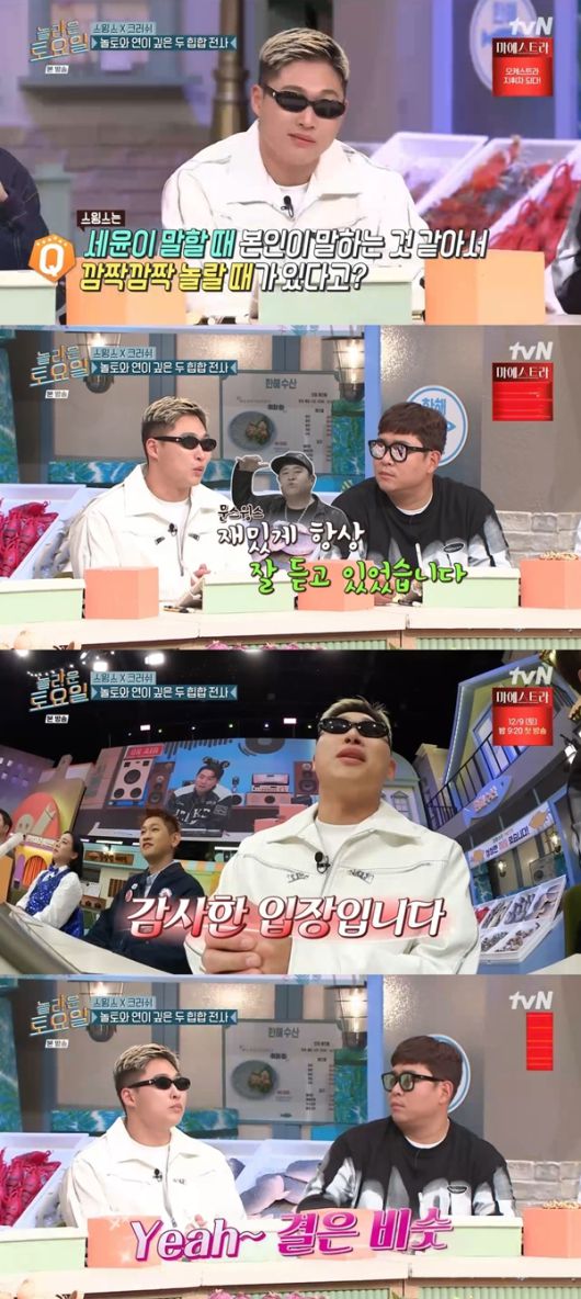25일 방송된 tvN ‘놀라운 토요일’(이하 ‘놀토’)에 스윙스가 게스트로 출연했다. 스윙스는 평소 자신을 패러디하는 문세윤과 인사를 나눴다. 문세윤은 ‘문스윙스’라는 별명을 가지고 있다.