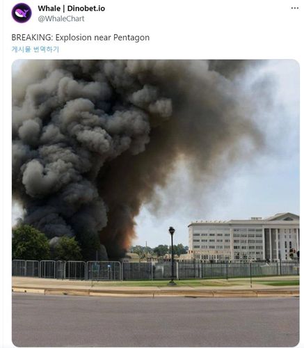 지난 5월22일(현지 시각) 오전 미국 뉴욕증시 개장을 전후해 트위터를 비롯한 소셜미디어에는 공공기관처럼 생긴 건물 앞에 엄청난 양의 검은 연기가 피어오르는 사진과 함께 '속보 : 펜타곤 근처에서 폭발'이라는 게시물이 유포되기 시작했다.