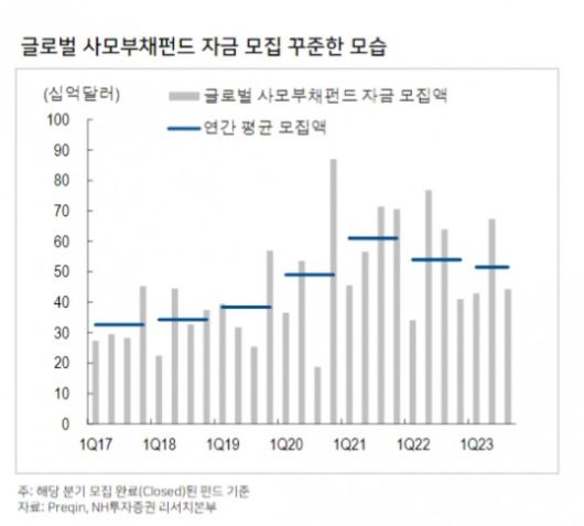 최성종 NH투자증권 연구원은 "2024년에도 사모대출 시장 성장과 안정적인 이익 창출을 전망한다"며 "공격적인 긴축으로 높아진 직접대출(다이렉트 렌딩) 금리가 이자이익과 전체 투자성과를 지지해줄 것으로 전망된다"고 제시했다.