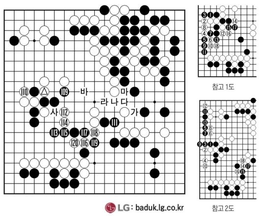 111은 우변 백 4점을 볼모로 잡고 백의 약점을 노리는 수다. 백이 ‘가’의 쌍립으로 연결하면 흑 ‘나’ 이하 ‘바’까지 흑 전체가 이어가는 무서운 노림이 숨어있다. 대응하지 않고 112로 손을 돌린 수가 정확했다. 다만 114는 ‘사’가 더 확실한 수. 116 차단에 흑도 117, 119로 격렬히 반발, 어지러운 중원 싸움이 지속된다.
