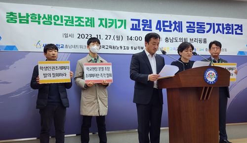 새로운학교충남네트워크, 전국교직원노동조합 충남지부, 충남실천교육교사모임, 충남좋은교사운동 등 관계자들은 27일 충남도청에서 기자회견을 열어 "충남도의회는 학생인권조례 폐지를 즉각 중단하고, 교권 보호 조례를 강화하라"고 촉구했다.