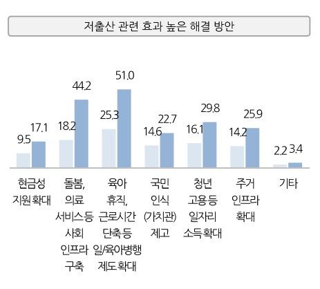 저출산위는 가장 효과가 높을 것으로 생각되는 저출산 해결 방안도 조사했다. 제시된 7가지 선택지 중 ‘육아 휴직, 근로 시간 단축 등 일·육아 병행제도 확대’가 25.3% 응답률을 얻어 가장 높았다. 이어 ‘돌봄·의료서비스 등 사회 인프라 구축’(18.2%), ‘청년 고용 등 일자리·소득 확대’ (16.1%) 순이었다. ‘국민 인식 제고’를 꼽은 응답자도 14.6%로 나타났지만, ‘현금성 지원 확대’는 9.5%에 그쳤다.