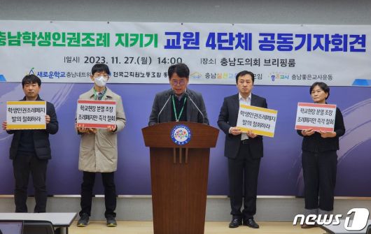 (내포=뉴스1) 이찬선 기자 = 전교조 충남지부와 새로운학교충남네트워크 등 4개 교원단체는 27일 의원 발의된 ‘충남학생인권조례폐지안’에 대한 반대입장을 표명했다.