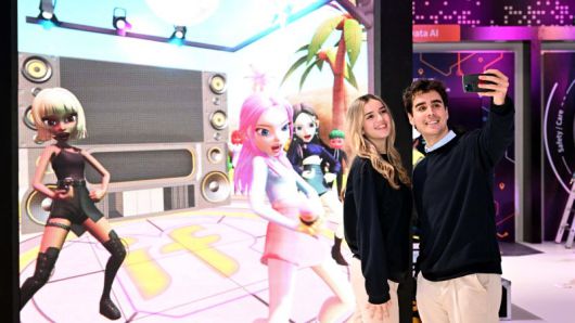 지난 2월 스페인 바르셀로나 피라 그란 비아 전시장 내에 설치된 SK텔레콤 부스에서 현지 관계자들이 메타버스 서비스 '이프랜드(ifland)'를 배경으로 기념 촬영하고 있다. |