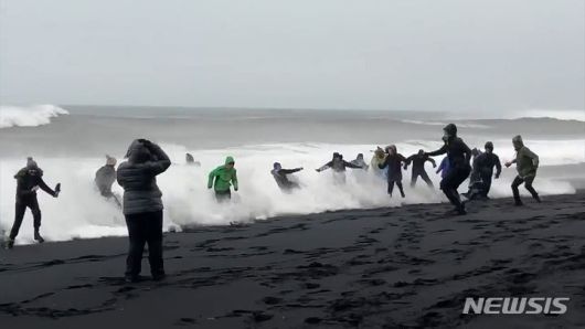[서울=뉴시스] 현성용 기자 = 북유럽 섬나라 아이슬란드의 명소인 레이니스파라(Reynisfjara) 해변을 찾은 관광객들이 다가오는 파도를 바라보며 인증샷을 남기려다 휩쓸리는 영상이 소셜미디어(SNS)에 올라와 논란이 됐다.