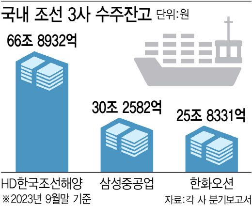 27일 각 사 분기 보고서에 따르면 HD한국조선해양(009540)의 지난 9월 말까지 수주잔고는 66조8932억원으로 집계됐다. 같은 기간 삼성중공업과 한화오션의 전체 수주잔고 역시 각각 30조2582억원, 25조8331억원으로 나타났다. 이는 지난 2009년 2분기 이후 최대량이자 조선사들의 3년 치 이상의 일감에 해당하는 수준이다.