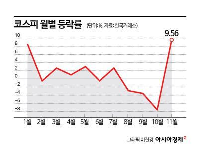 28일 한국거래소에 따르면 코스피는 이달 들어 9.56% 상승했다. 월별 기준으로 올 들어 가장 높은 수치다. 특히 지난 달에 7.59% 하락하며 월별 최대 낙폭을 기록한 점을 감안할 때 이달 상승세가 돋보였다.