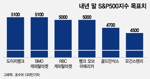 RBC 캐피탈마켓의 미국 주식전략팀장인 로리 캘버시나가 이끄는 팀도 지난주 기본적인 시나리오에서 S&P500지수가 내년 말 5000까지 상승할 것으로 전망했다. 다만 비관적인 시나리오에서는 4700까지 오르는데 그치고 낙관적인 시나리오에서는 5300까지 급등할 수 있다고 봤다.