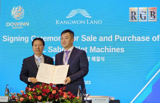 ▲지난 1월 12일 필리핀 마닐라베이 호텔에서 이삼걸 강원랜드 사장이 동남아시아 슬롯머신 유통사 RGB와 슬롯머신 30대 판매 계약 체결식을 갖고 있다. ⓒ강원랜드 |