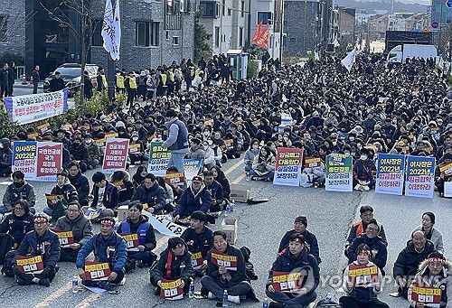 (전주=연합뉴스) 임채두 기자 = 28일 오후 전북혁신도시 내 국민연금공단 앞에서 민주노총 공공운수노조 국민연금지부 조합원들이 연금 공공성 강화, 직무급제 저지, 실질임금 인상 쟁취를 위한 총파업 집회를 열고 있다. 2023.11.28