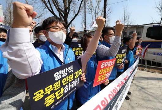 공무원노조총연맹 조합원들이 지난해 4월 공무원노조 타임오프제 도입 등을 촉구하며 기자회견을 하고 있다. 연합뉴스 |