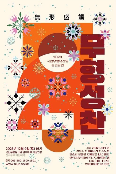 문화재청 국립무형유산원(원장 안형순)은 송년공연 '무형성찬無形盛饌'을 12월 9일 토요일 오후 4시, 국립무형유산원 얼쑤마루 대공연장(전북 전주시)에서 개최한다.