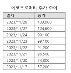 28일 한국거래소에 따르면 에코프로머티는 투자경고 종목 지정에도 전 거래일 대비 6.74% 오른 13만3000원에 거래를 마쳤다. 지난 23일 이후 4거래일 연속 상승세다.