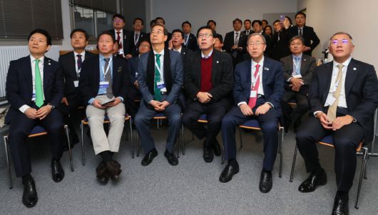 정의선 현대차그룹 회장(오른쪽부터), 반기문 전 유엔 사무총장, 박형준 부산시장, 한덕수 국무총리, 최태원 대한상의 회장, 장성민 대통령실 미래전략기획관을 비롯한 대표단이 28일 오후(현지시간) 프랑스 파리 외곽 팔레 데 콩그레에서 열린 제173차 국제박람회기구(BIE) 총회에서 2030년 세계박람회 개최지 선정 투표 결과 부산이 탈락하자 아쉬워하고 있다. 연합 |