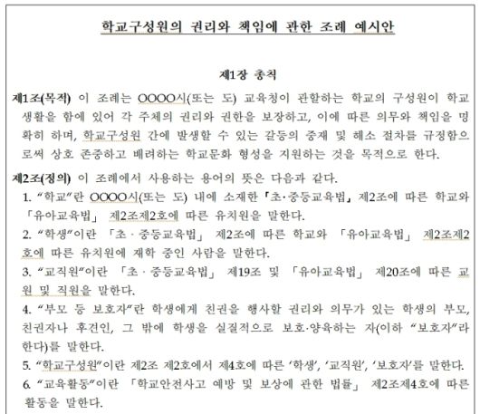 '학교구성원의 권리와 책임에 관한 조례 예시안' 일부. [사진=교육부 제공] |
