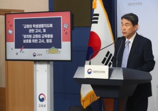 이주호 부총리 겸 교육부 장관이 지난 8월 17일 오전 서울 종로구 정부서울청사 별관에서 교원의 학생생활지도에 관한 고시 및 유치원 교원의 교육활동 보호를 위한 고시를 발표하고 있다. |