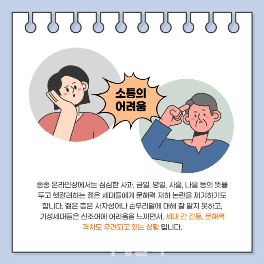 종종 온라인상에서는 심심한 사과, 금일, 명일, 사흘, 나흘 등의 뜻을 두고 헷갈려하는 젊은 세대들에게 문해력 저하 논란을 제기하기도 합니다. 젊은 층은 사자성어나 순우리말에 대해 잘 알지 못하고, 기성세대들은 신조어에 어려움을 느끼면서, 세대 간 갈등, 문해력 격차도 우려되고 있는 상황 입니다.