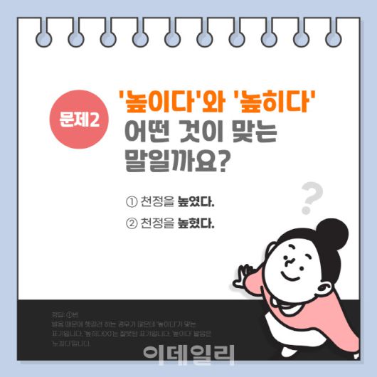 정답: 1번/ 발음 때문에 헷갈려 하는 경우가 많은데 ‘높이다’가 맞는 표기입니다. ‘높히다(X)’는 잘못된 표기입니다. ’높이다‘ 발음은 ’노피다‘입니다.