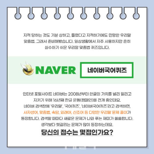 지적 당하는 것도 기분 상하고, 틀렸다고 지적하기에도 민망한 우리말 맞춤법. 그래서 준비해봤습니다. 일상생활에서 자주 사용하지만 흔히 실수하기 쉬운 우리말 맞춤법 퀴즈입니다. 인터넷 포털사이트 네이버는 2008년부터 한글의 가치를 널리 알리고 지키기 위해 16년째 한글 운동(캠페인)을 전개 중인데요. 네이버 검색창에 ’우리말‘, ’국어퀴즈‘, ’네이버국어퀴즈‘라고 검색하면, 사자성어, 맞춤법, 속담, 외래어, 신조어 등 다양한 우리말 문제 풀이가 등장합니다. 검색할 때마다 새로운 문제가 나와 푸는 재미가 쏠쏠합니다. 생각보다 헷갈리는 문제가 많이 등장하는데요. 당신의 점수는 몇점인가요?