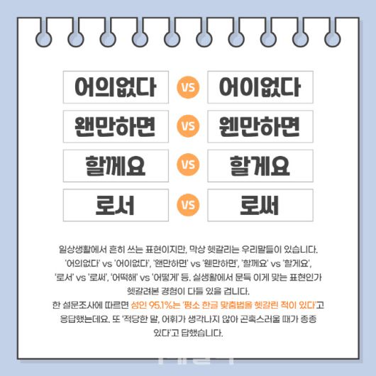 [이데일리 최민아 기자]일상생활에서 흔히 쓰는 표현이지만, 막상 헷갈리는 우리말들이 있습니다. ‘어의없다’ vs ‘어이없다’, ‘왠만하면’ vs ‘웬만하면’, ‘할께요’ vs ‘할게요’, ‘로서‘ vs ’로써’, ‘어떡해‘ vs ’어떻게’ 등. 실생활에서 문득 이게 맞는 표현인가 헷갈려본 경험이 다들 있을 겁니다. 한 설문조사에 따르면 성인 95.1%는 ‘평소 한글 맞춤법을 헷갈린 적이 있다’고 응답했는데요. 또 ‘적당한 말, 어휘가 생각나지 않아 곤혹스러울 때가 종종 있다‘고 답했습니다.