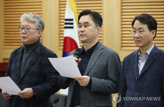 더불어민주당 조응천(왼쪽부터), 김종민, 이원욱 의원이 지난 26일 국회에서 연 '원칙과 상식, 전문가에게 듣는다' 세미나 시작 전 선거제 관련 성명을 발표하고 있다. 연합뉴스 |
