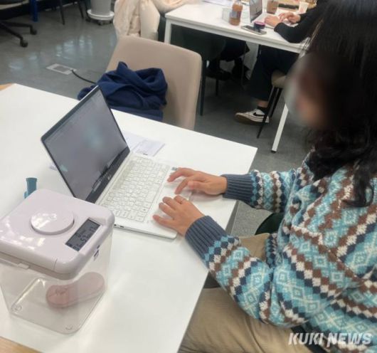 마우스를 두 시간 동안 금욕상자에 넣은 동료 기자의 모습. 사진=이예솔 기자 |