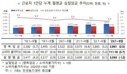 다만 9월 한 달만 놓고 보면 실질임금이 382만원으로, 작년보다 1.9% 오르며 7개월 만에 전년 대비 하락세를 멈췄다.