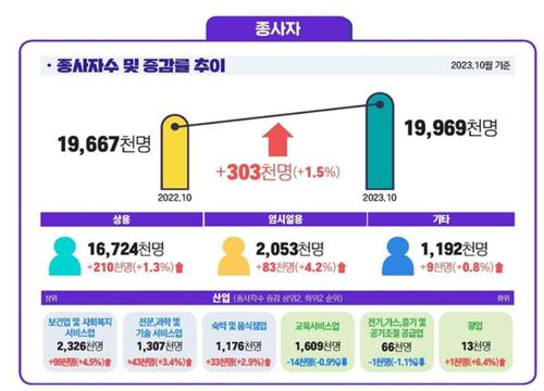 10월말 기준 사업체 종사자 수는 1천996만9천 명으로, 작년 9월 대비 30만3천 명(1.5%) 증가했다.