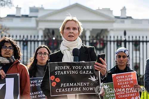 미국 배우 신시아 닉슨이 27일 백악관 앞에서 열린 시위에서 영구 휴전을 촉구하고 있다. [AFP=연합뉴스] |