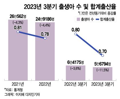 저출산이 계속되며 올해 3분기 합계출산율이 같은 분기 기준 역대 최저치인 0.7명에 머물렀다.