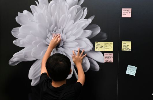 사망한 서이초 교사의 49제를 맞은 4일 오전 한 학생이 서울 서초구 서이초등학교 마련된 추모공간에 추모글을 붙이고 있다 . 이상섭 기자 |