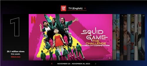 29일 넷플릭스 공식 사이트 '넷플릭스 톱(TOP) 10'에 따르면 11월 넷째주(20~26일) '오징어 게임: 더 챌린지'의 시청 시간은 총 8570만 시간으로, 영어권 TV 부문에서 가장 많았다.