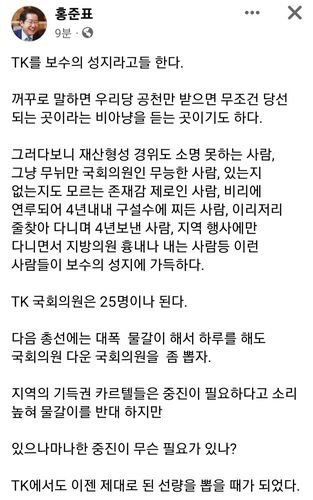 홍 시장은 특히 "재산형성 경위도 소명 못 하는 사람, 무늬만 국회의원인 무능한 사람, 있는지 없는지도 모르는 존재감 제로인 사람, 비리에 연루돼 4년 내내 구설수에 찌든 사람, 이리저리 줄 찾아다니며 4년을 보낸 사람, 지역 행사에만 다니면서 지방의원 흉내나 내는 사람 등 이런 사람들이 보수의 성지에 가득하다"고 질타하기도 했다.