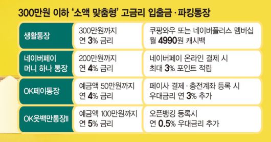 50만원 또는 100만원 이하의 소액임에도 연 최고 5~7% 금리를 제공하는 파킹통장도 있다. OK저축은행의 'OK페이통장'의 경우 50만 원 이하에 기본금리를 연 4%로 제공하며 4대 페이사(네이버페이, 카카오페이, 페이코, 토스페이)에 결제·충전계좌로 등록 시 우대금리 연 3%가 추가된다. 100만원 이하인 경우 'OK읏백만통장II'이 연 최고 5%로 기존 파킹통장 중에 가장 높은 이자를 제공한다.