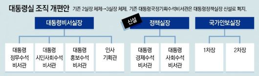 여권 핵심 관계자는 3실, 5수석 체제에 대해 “과학기술수석, 환경노동수석은 신설하지 않는 방향으로 굳어지는 분위기”라고 했다. 대통령실 관계자는 “2030 부산 엑스포 유치가 불발됨에 따라 대통령실 안에서 엑스포 업무를 전담했던 미래전략기획관실도 정리 수순”이라고 말했다.