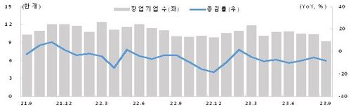 지난 9월 창업기업은 9만1천907개로 지난해 동월보다 8.2% 줄었다. 업종별로는 제조업 7.2%, 서비스업 8.9%, 건설업 11.5%, 부동산업 26.9% 각각 감소했다.