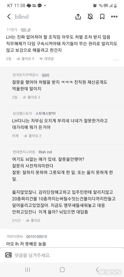 B씨는 'LH는 없어져야 할 조직임. 아무도 처벌 조차 받지 않음'이라는 다른 이용자 글에는 "잘못을 했어야 처벌을 받지. 전 직원 재산공개도 억울한데 말이지"라는 글을 남겼고, 'LH 해체해야 한다'는 글에는 "고마워 좀만 힘내줘"라는 비아냥 댓글을 남겼다.