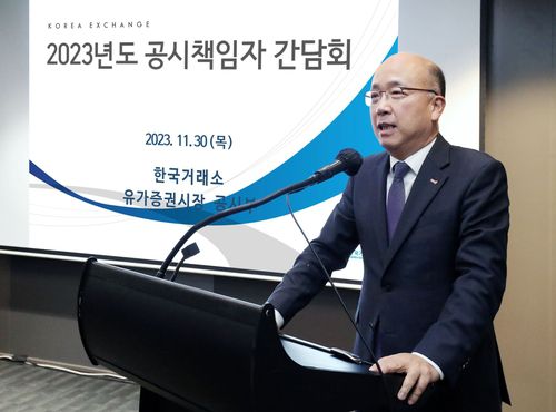 ▲ 한국거래소는 30일 유가증권시장 상장법인 48개사의 공시책임자를 대상으로 간담회를 개최해 상장 제도 관련 변경 내용에 관해 설명하고 성실 공시를 위한 공시책임자의 역할을 강조했다고 밝혔다. 정지헌 거래소 유가증권시장본부 상무는 "내년부터 시행되는 영문 공시 의무화 일정에 맞춰 영문 공시가 더욱 활성화될 수 있도록 만전을 기해달라"며 "투자자가 배당금액을 확인한 후 투자 여부를 결정할 수 있도록 하는 배당절차 개선에 상장법인이 적극적으로 참여해달라"고 당부했다. (서울=연합뉴스)