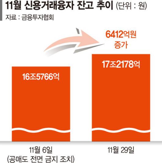 공매도 금지가 시행됐던 11월 6일 16조5766억원 수준이던 신용거래융자 잔고는 6400억원가량 급증했다. 코스피가 1672억원, 코스닥이 4740억원 각각 확대됐다. 국내 증시가 강세를 보이면서 주가 상승에 대한 기대감이 커진 때문이다. 미국 연방준비제도(Fed)의 금리인상 종료 기대가 커진 것도 투자심리를 자극했다. 이달 초 2300선까지 주저앉은 코스피지수는 11월 마지막날 2535.29까지 올랐다.