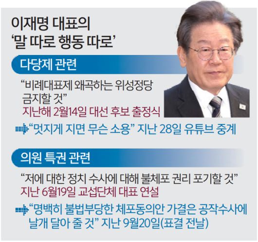 이 대표는 불체포 특권 관련 말 바꾸기 논란도 일으켰다. 그는 지난 6월 국회 연설에서 “저에 대한 정치 수사에 대해 불체포 권리를 포기하겠다”고 했다. 원고에 없던 발언이었다. 대여 공세를 위해 던진 승부수로 해석됐다. 그런데 지난 9월 자신에 대한 체포동의안이 국회로 넘어오자 표결 전날 페이스북에 부결을 호소하는 글을 올렸다.