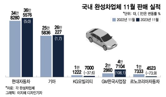 현대자동차가 신형 싼타페를 내세워 지난달 내수 판매를 이끌었다. 기아와 GM한국사업장은 수출 선전에 힘입어 판매량이 크게 늘었지만 통합공사로 생산라인이 중단된 KG모빌리티와 신차가 없는 르노코리아자동차는 부진했다.