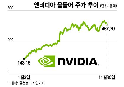 엔비디아가 11월 마지막 거래일인 30일(현지시간) 2.9% 하락한 467.70달러로 마감했다.
