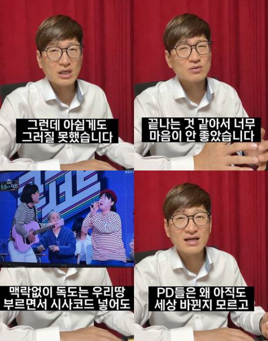 또한 그는 "PD들은 왜 아직도 세상 바뀐지 모르고 소파에 앉아서 '안녕하십니까!' 하면서 들어오는 애들만 기다리고 있냐. 개그맨들한테 다 직접 전화 돌리고 잘 나가는 애들 찾아서 바짓가랑이 붙잡고서라도 다 데려와서 더 재미있게 만들었어야지"라며 영상을 마무리했다.